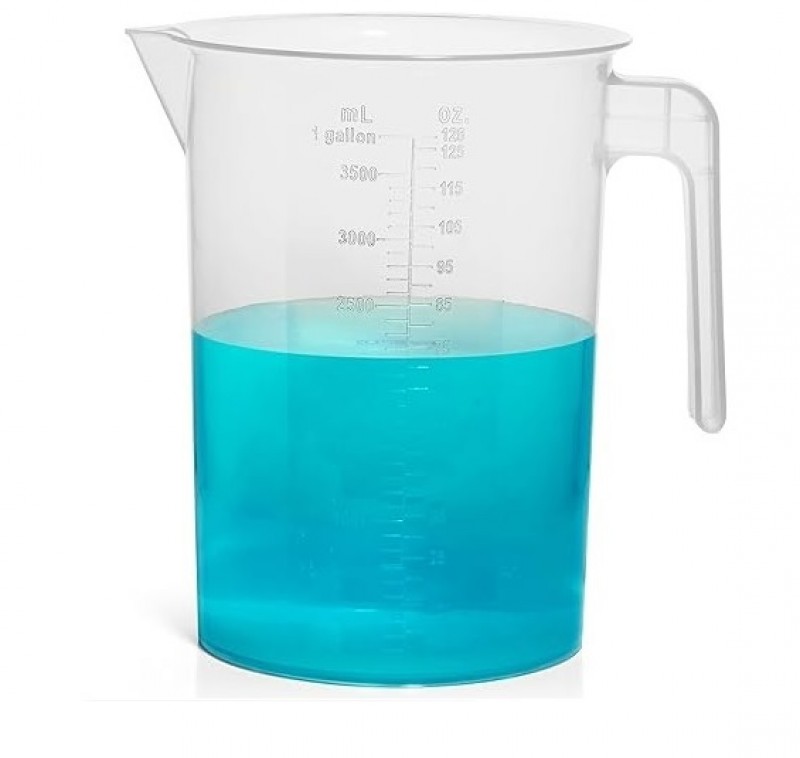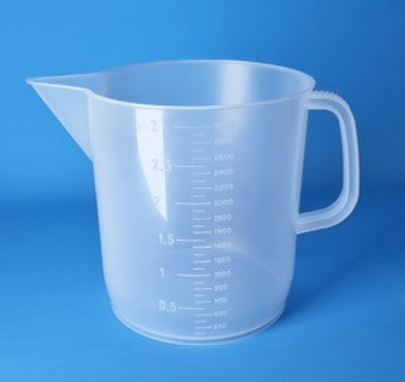 A plastic measuring jug is a transparent, cylindrical container used for measuring liquids or solids in recipes, experiments, or other applications.
