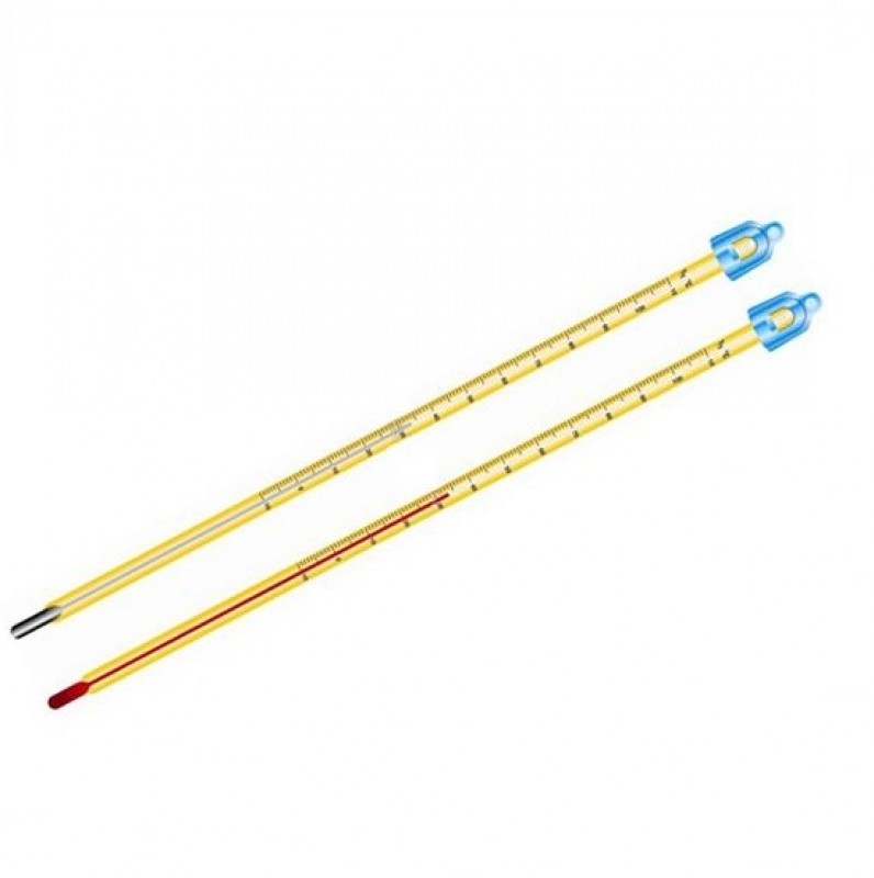 Ashwa Exim Glass capillary with bulb type, yellow back, printed scale. Length 300mm with blue plastic ring on top. Available in Mercury and Alcohol Types.