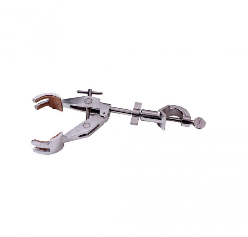 Retort Clamp Cross Pattern Rotatable Made of Pressure Die Cast Zinc Alloy, Four Prong Cork Lined Jaw Clamp fitted to 2" Long Mild Steel Nickel Plated Rod, Rotatable & Lockable at any angle. Fitted with a Boss head with Mild Steel Thumb Type Screw Key Accepts Objects up to 100 mm Dia.