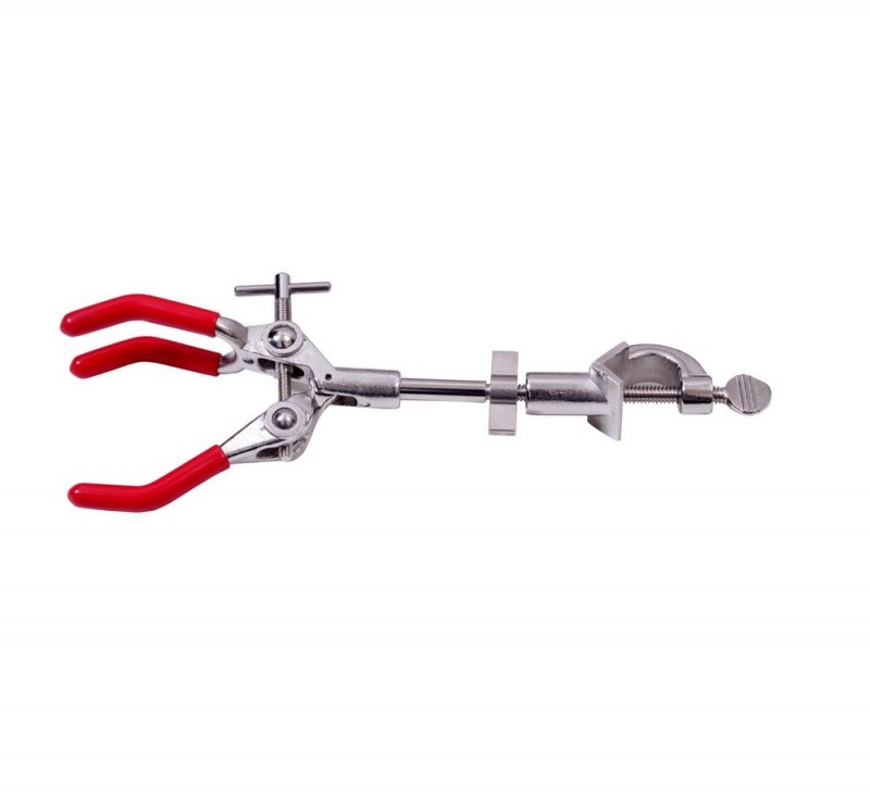 Three Prong Clamp Rotatable Made of Pressure Die Cast Aluminum Alloy, Three Prong PVC Sleeve Covered Jaw Clamp fitted to 2" Long Mild Steel Nickel Plated Rod, Rotatable & Lockable at any angle. Fitted with a Boss head with Mild Steel Thumb Type Screw Key Accepts Objects up to 100 mm Dia.